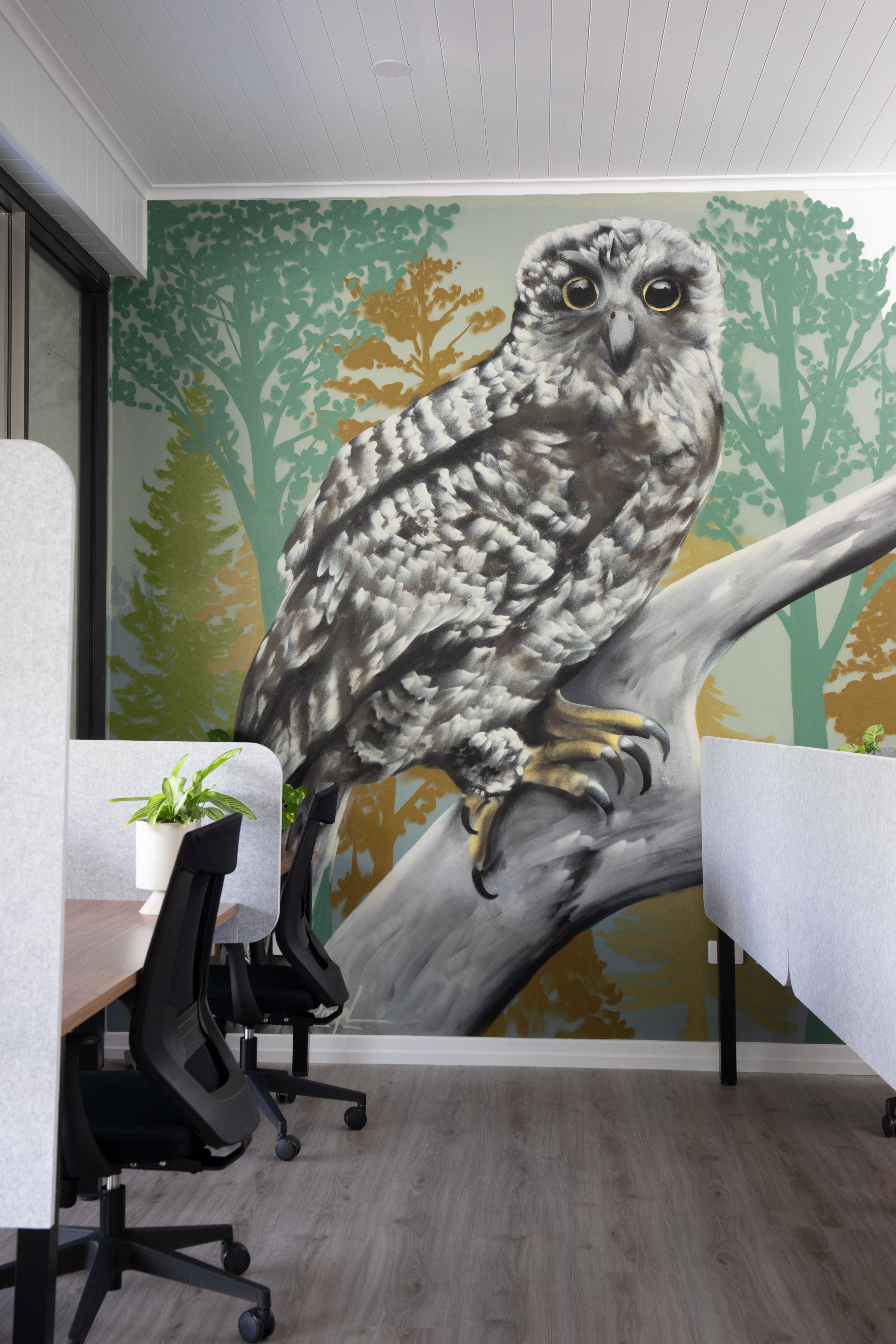 Artistic expression plays a central role in defining the workspace’s identity. A Bruce Lee mural, requested by the client, adds energy and inspiration, while the Powerful Owl, a well-known Samford Valley symbol, celebrates local heritage. Both were created by the talented Samford-based artist Travis of Drapl Art, ensuring the space is deeply rooted in its community.