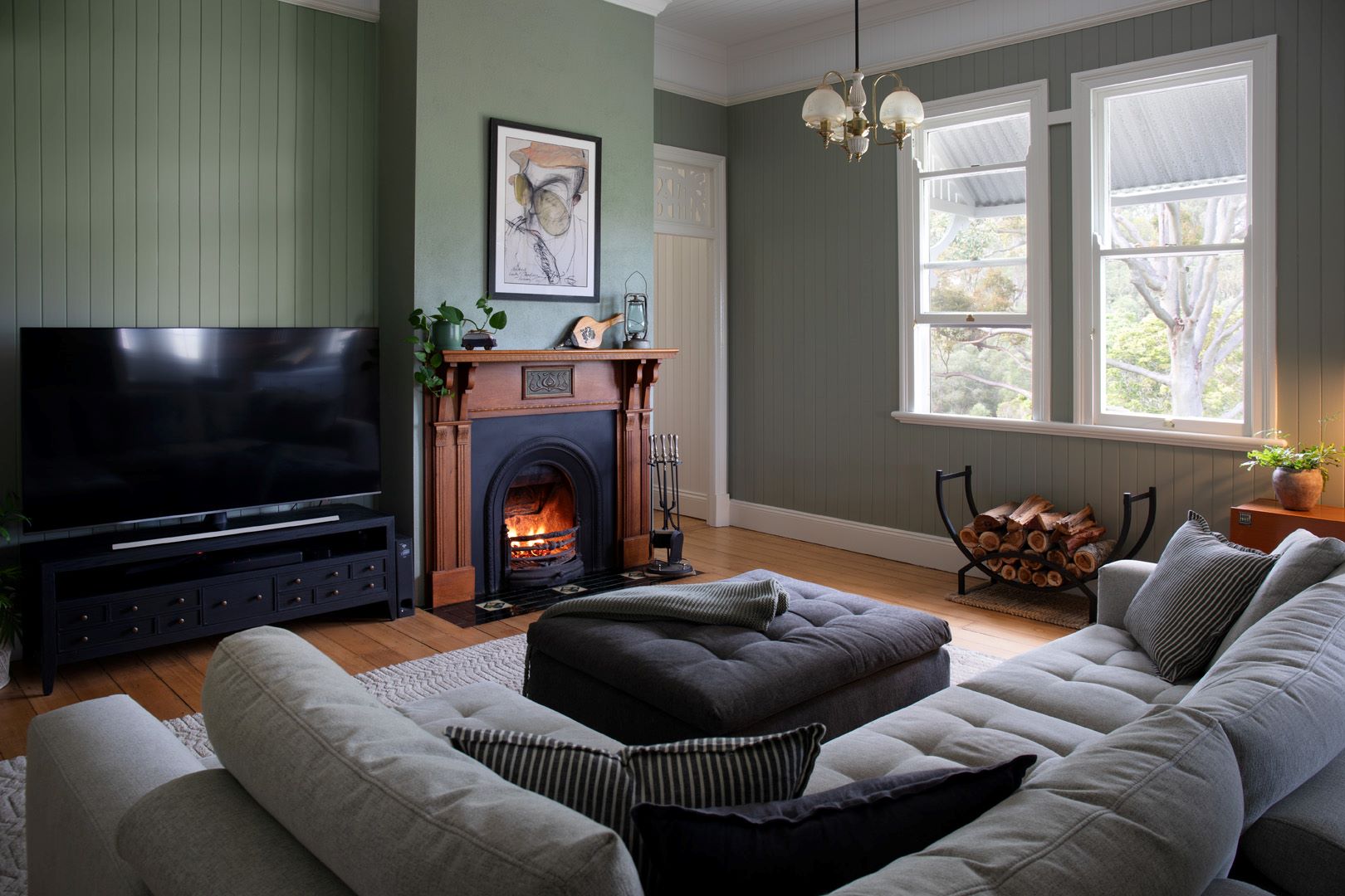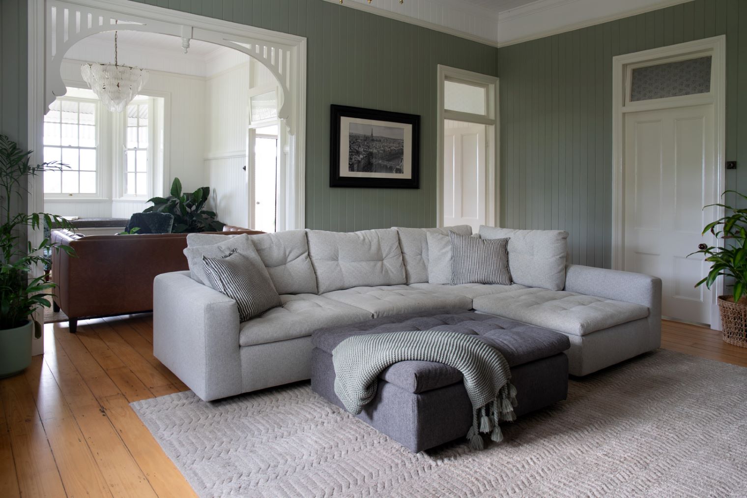The central living room was reimagined to allow for cosy nights and listen to old records. The entire room is wrapped in Porters Paints Olive Grove with Gloss Whisper White trims for freshness and to enhance the beautiful details. This room is all about comfort and cool vintage vibes. The artwork creates a perfect level of tension in what could have easily been a more traditional look.