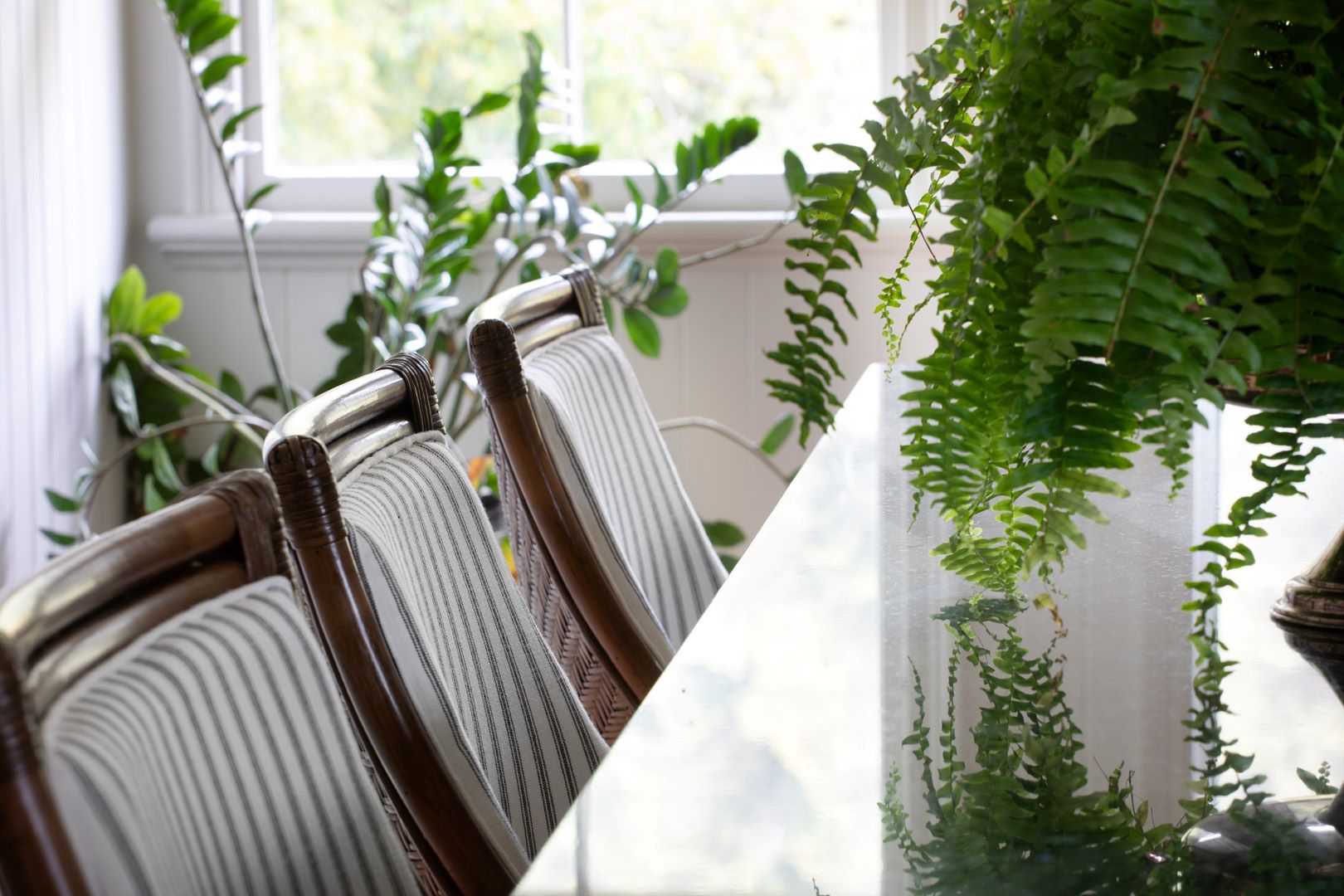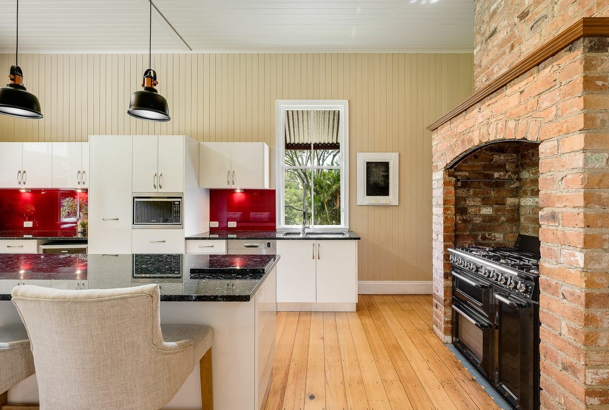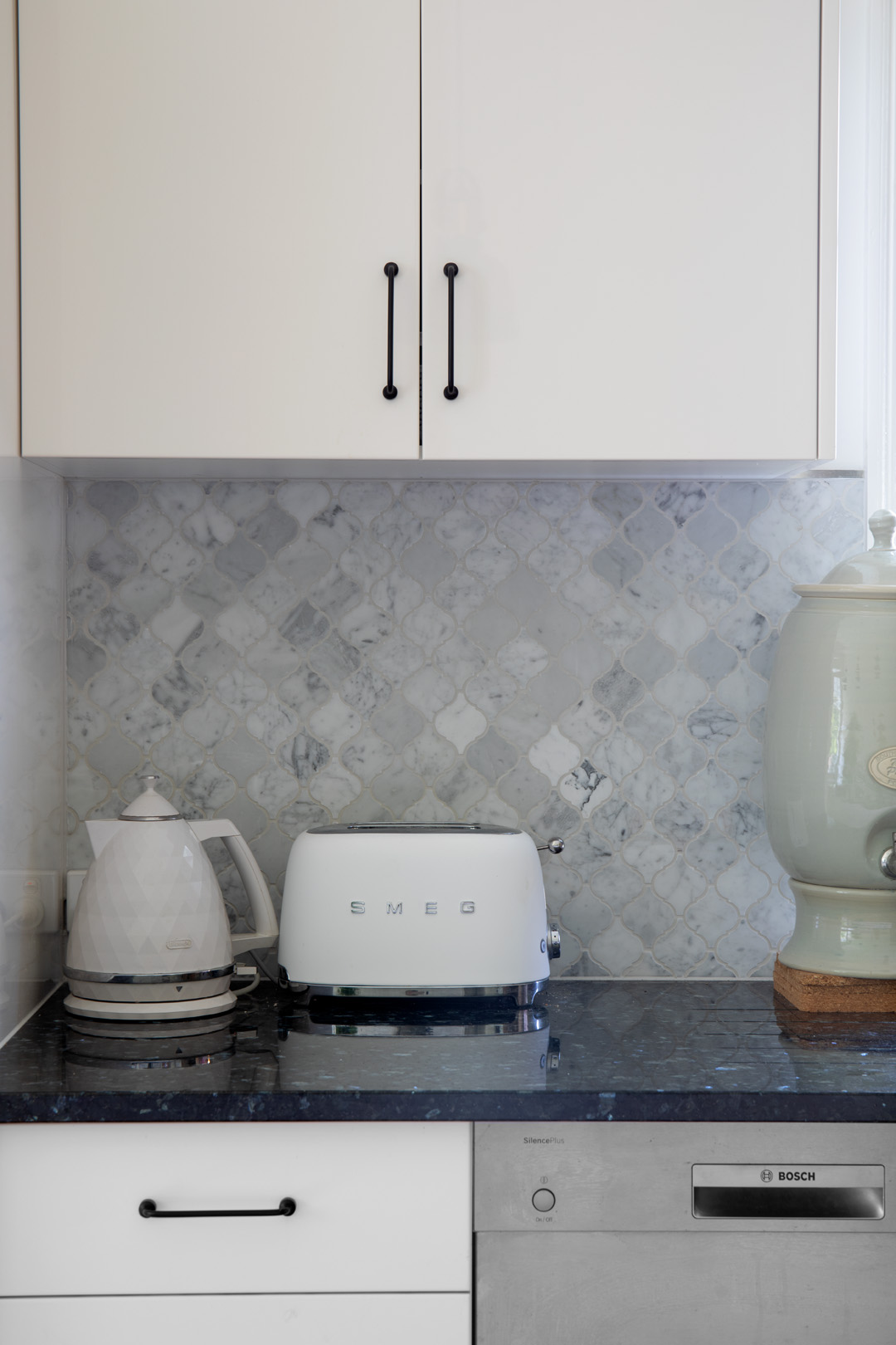 The kitchen came with the wonderful inclusion of an original brick stove opening. Wanting to minimise work allocation here, we returned the kitchen splash back to an appropriate marble lantern tile, changed handles from chrome to matt black and selected classic stools with a ticking stripe.