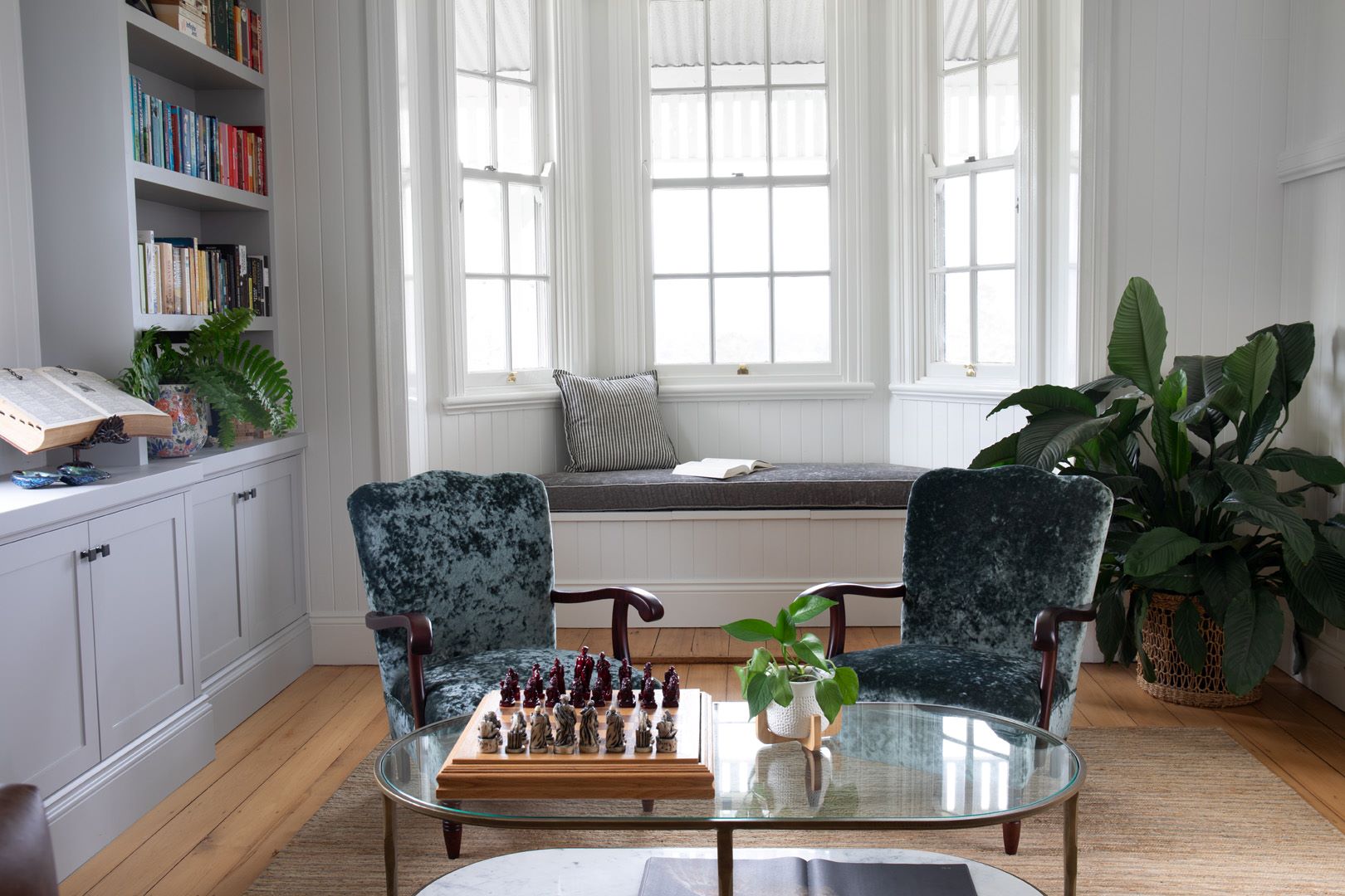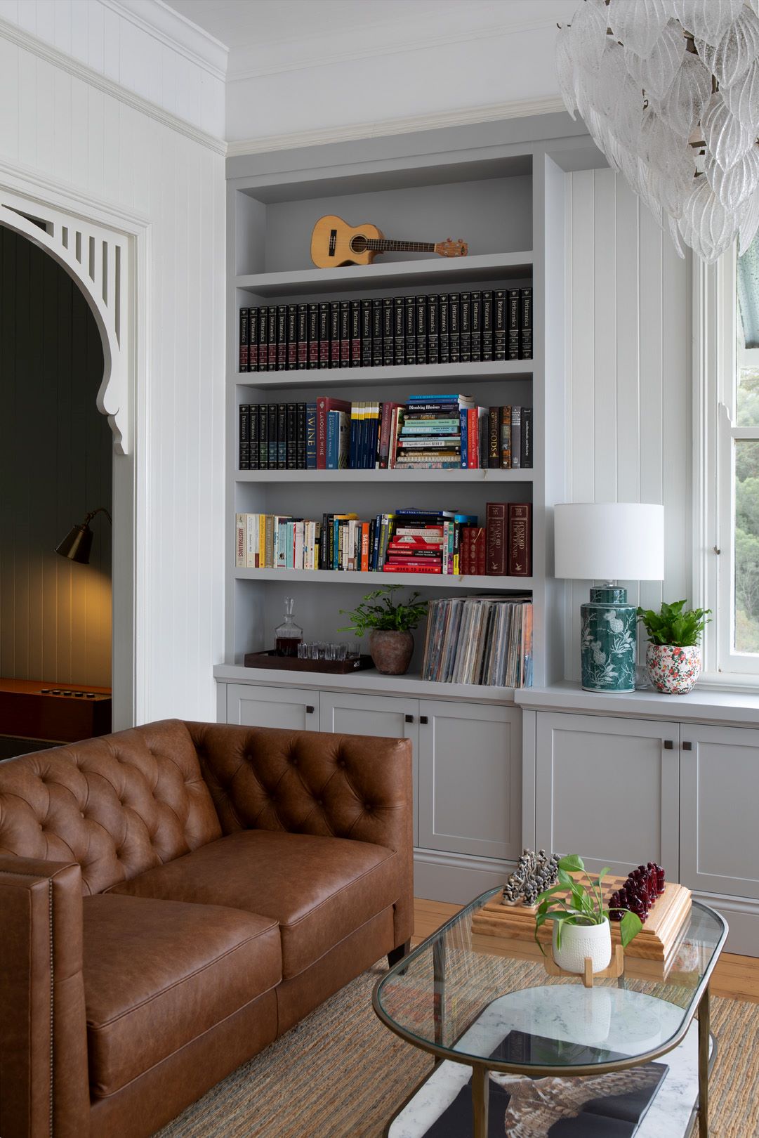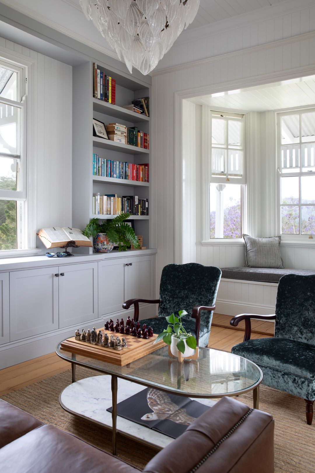 A library was a must for the couple, partly to house the extensive book collection and secondly as a place for the record collection. Reupholstered vintage chairs, paired with a leather sofa and new pendant light speaks to the glamour of the early 1900’s. A layered coffee table displays a favourite chessboard and book. The library has become a place for long conversations over whiskey, reading, entertaining guests, or just staring at the stunning view.
