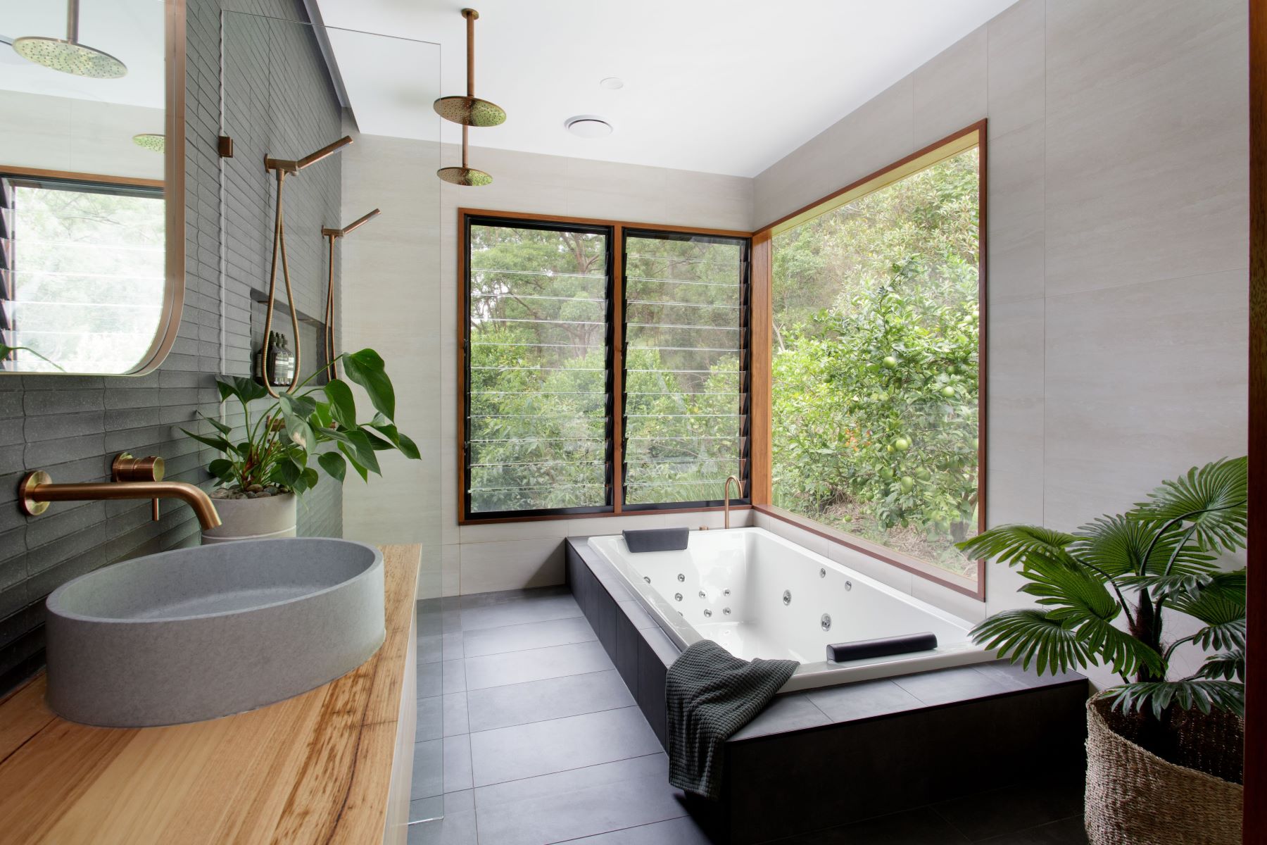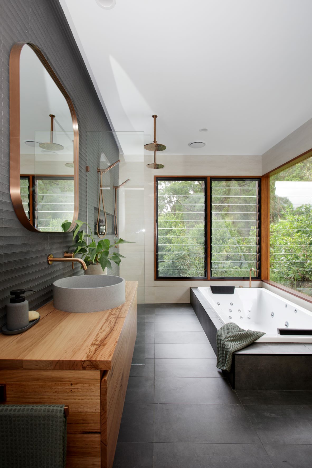 With a client request for a moody and sexy ensuite, it was quickly decided that a dark colour palette was appropriate. The charcoal tones of the Japanese Inax tiles are layered with copper and timber for warmth.