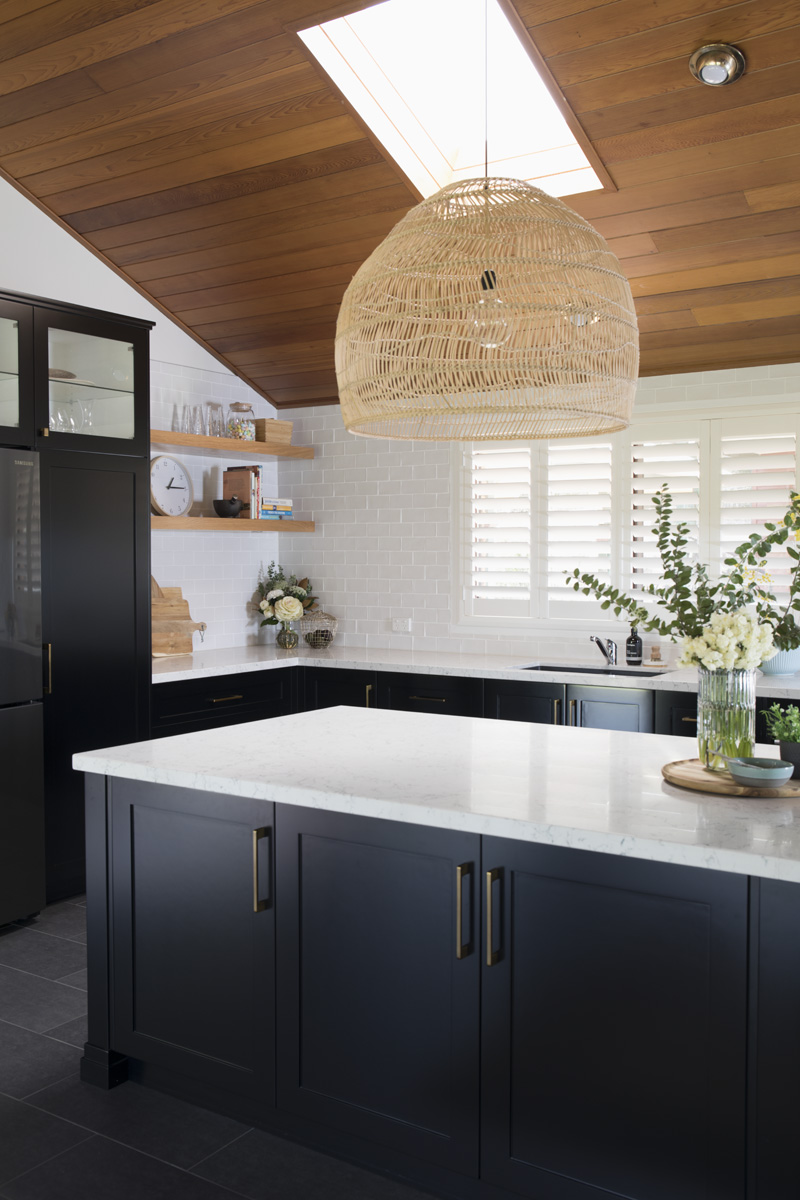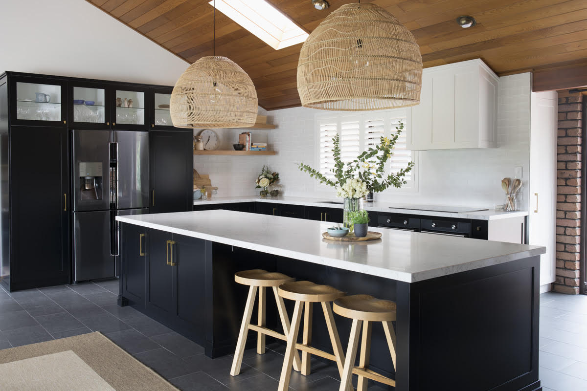 A focal point of the kitchen, the existing fireplace was rendered and restyled with a custom oak mantel. Oversized pendant lighting accentuates the high ceilings, and the kitchen hearth provides a natural spot for casual dining at the island bench—bringing warmth and connection to the heart of the home.
